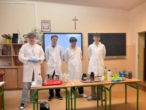 Uczniowie klasy 3b zostali ponownie zaproszeni do poprowadzenia doświadczeń chemicznych dla małych żaków uczęszczających na zajęcia organizowane przez Starachowicki Uniwersytet Dzieci. Uczniowie klasy 3b – Jacob Niewczas, Dorian Kuźdub, Gabriel Jeśko i Piotr Wyskiel – pod kierunkiem nauczyciela chemii, Danuty Kucharczyk, przygotowali zestaw doświadczeń, który został zaprezentowany małym studentom. Dzieciaki