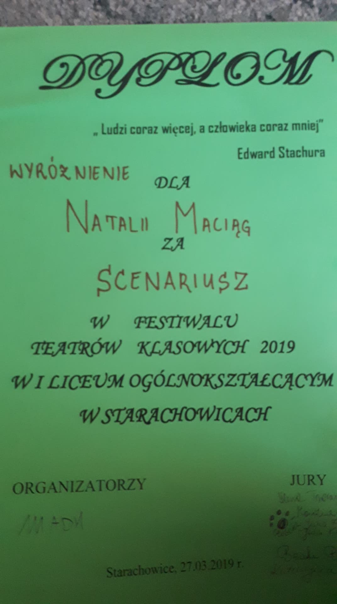 Z okazji Międzynarodowego Dnia Teatru w naszej szkole - wedle corocznej tradycji - 27 marca zorganizowano Festiwal Teatrów Klasowych. Tegoroczne przewodnie hasło stanowił cytat Edwarda Stachury: "Ludzi coraz więcej, a człowieka coraz mniej". Każda klasa miała za zadanie przygotować przedstawienie opierające się na przewodnim temacie, który uprzednio wylosowała.