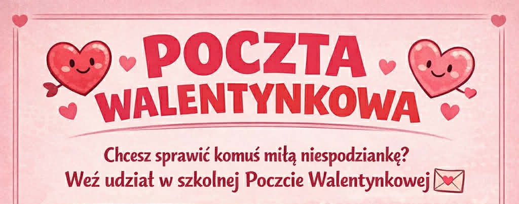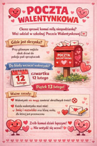 Samorząd Uczniowski zaprasza do udziału w Poczcie Walentynkowej! Wszystkie szczegóły znajdziecie na plakacie poniżej. Zapraszamy do wspólnej zabawy!