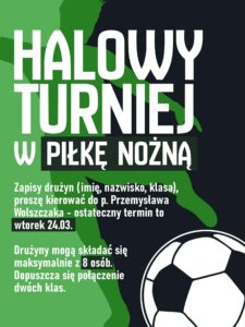 2026-03-19 Szkolny turniej piłki halowej Czekamy na zgłoszenia i zapraszamy do udziału! Szczegóły na plakacie.