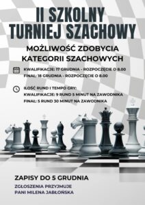 Zapraszamy wszystkich do udziału w Szkolnym Turniej Szachowym. Wszelkie niezbędne informacje znajdziecie na plakacie poniżej.